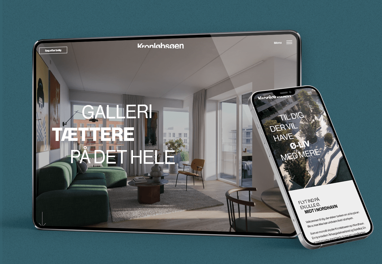 An adequate and precise decision basis is crucial when selling a project like Kronløbsøen not yet built. Therefore, the purpose of our strategic work is to eliminate uncertainty and doubt. In Kronløbsøen, we do this by creating credible and strong synergies between the website, the interactive area and apartment selector, and the marketing material.